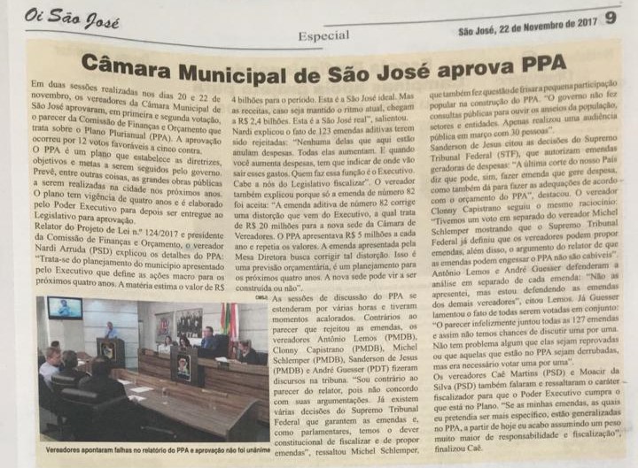 Câmara Municipal de São José aprova PPA no Jornal Oi São José Posted on27 de novembro de 201727 de novembro de 2017AutorPhilipe Costa Matéria sobre aprovação do PPA explicada em detalhes pelo vereador Nardi Arruda na câmara municipal de São José no Jornal Oi São José edição nº 259, página 9. 22.11.2017.