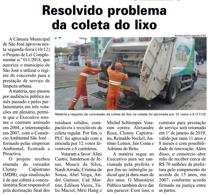 O Jornal Correio de Santa Catarina, edição de 14 de dezembro, página 3, relatou sobre a votação na Câmara do projeto de lei referente à concessão dos serviços de coleta de lixo.