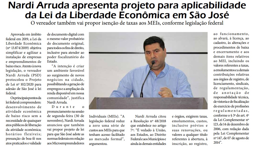 O Jornal Folha de Santa Catarina, edição nº 268, de dezembro de 2020, informa sobre o projeto de lei do vereador Nardi Arruda para que São José aplique a lei federal sobre a Liberdade Econômica.
