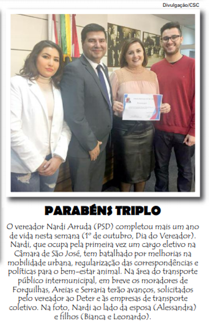 O Jornal Correio de Santa Catarina, edição nº 842, de 5 de outubro, parabenizou o vereador Nardi Arruda (PSD) pelo aniversário, pelo Dia do Vereador e conquistas de melhorias para São José.