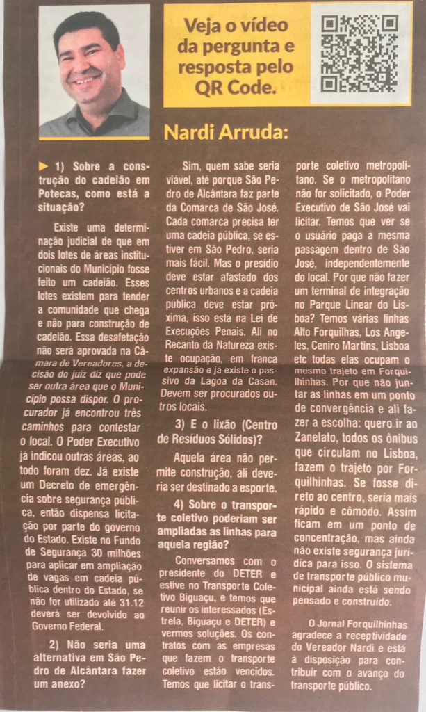 O Jornal de Forquilhinha, de 5 de julho de 2018, entrevistou o vereador Nardi Arruda (PSD). O vereador falou sobre seu posicionamento contrário à construção do Cadeião em Potecas.