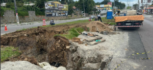 Outro destaque da intervenção é a construção de um canteiro central em formato de “V”, com rebaixamento do nível do solo, formando um bolsão destinado ao escoamento das águas, com uma profundidade média de 2 metros. Após a conclusão da etapa estrutural, o local receberá plantio de grama, criando um dreno natural que contribui para a absorção da água e para a melhoria paisagística da avenida.