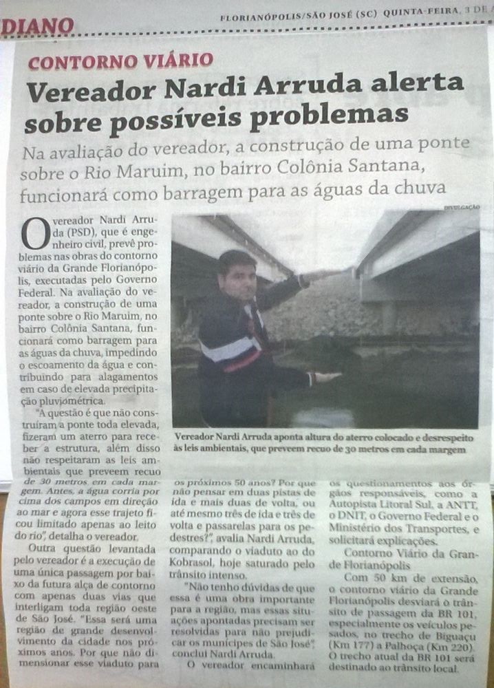 Vereador Nardi Arruda alerta sobre possíveis problema no Jornal Informe Posted on15 de agosto de 201715 de setembro de 2017AutorPhilipe Costa Matéria sobre o alerta que o Vereador Nardi Arruda faz sobre a construção do contorno viário da Grande, principalmente da construção da ponte do Rio Maruim no Jornal Informe edição nº 364, página 04. 02.08.2017