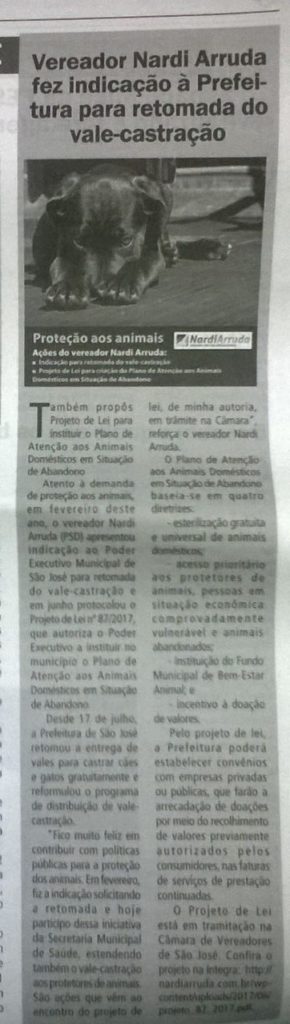 Vereador Nardi Arruda atento as demandas de proteção aos animais com a retomada do vale-castração no Jornal Tribuna Josefense Posted on31 de julho de 201715 de setembro de 2017AutorPhilipe Costa Matéria sobre a atenção em que o Vereador Nadi Arruda dá a causa de animais como sua indicação para a retomada do vale-castração, no Jornal Tribuna Josefense, edição nº 250, página 05. 2ª quizena de Julho de 2017