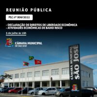 A Câmara Municipal de São José sedia Reunião Pública no dia 05 de julho, às 16h. O tema do encontro trata-se do Projeto de Lei Complementar nº 006/2022 que traz em sua ementa: “a declaração de direitos de liberdade econômica, … Continue lendo… →